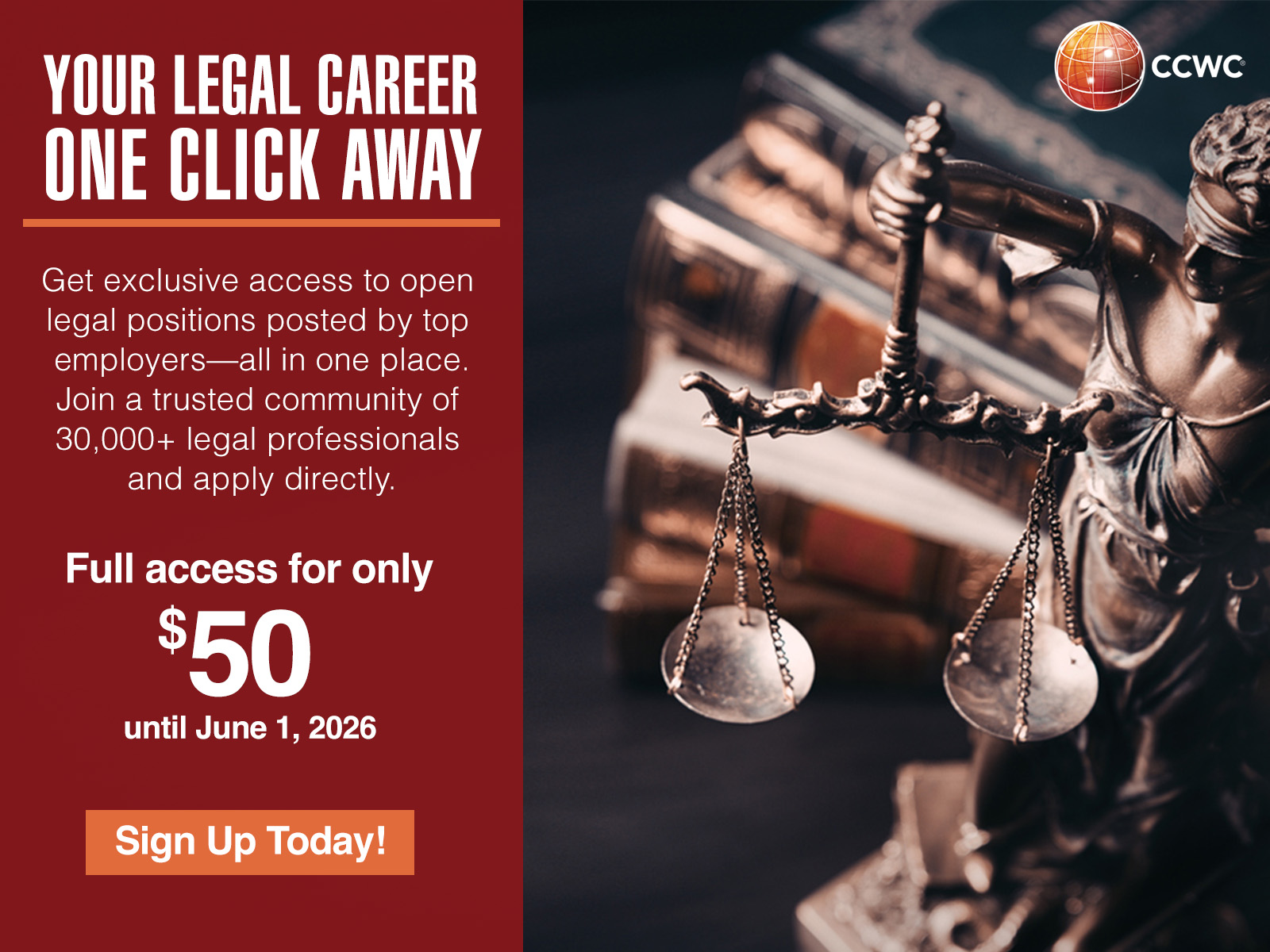 The CCWC®️ Jobs Portal is a curated hub where employers post open legal positions for our community of 30,000+ legal professionals. Job seekers can browse listings and connect directly with employers. The portal serves as a visibility and access tool for both employers and candidates. Find your next meaningful job through CCWC®️.